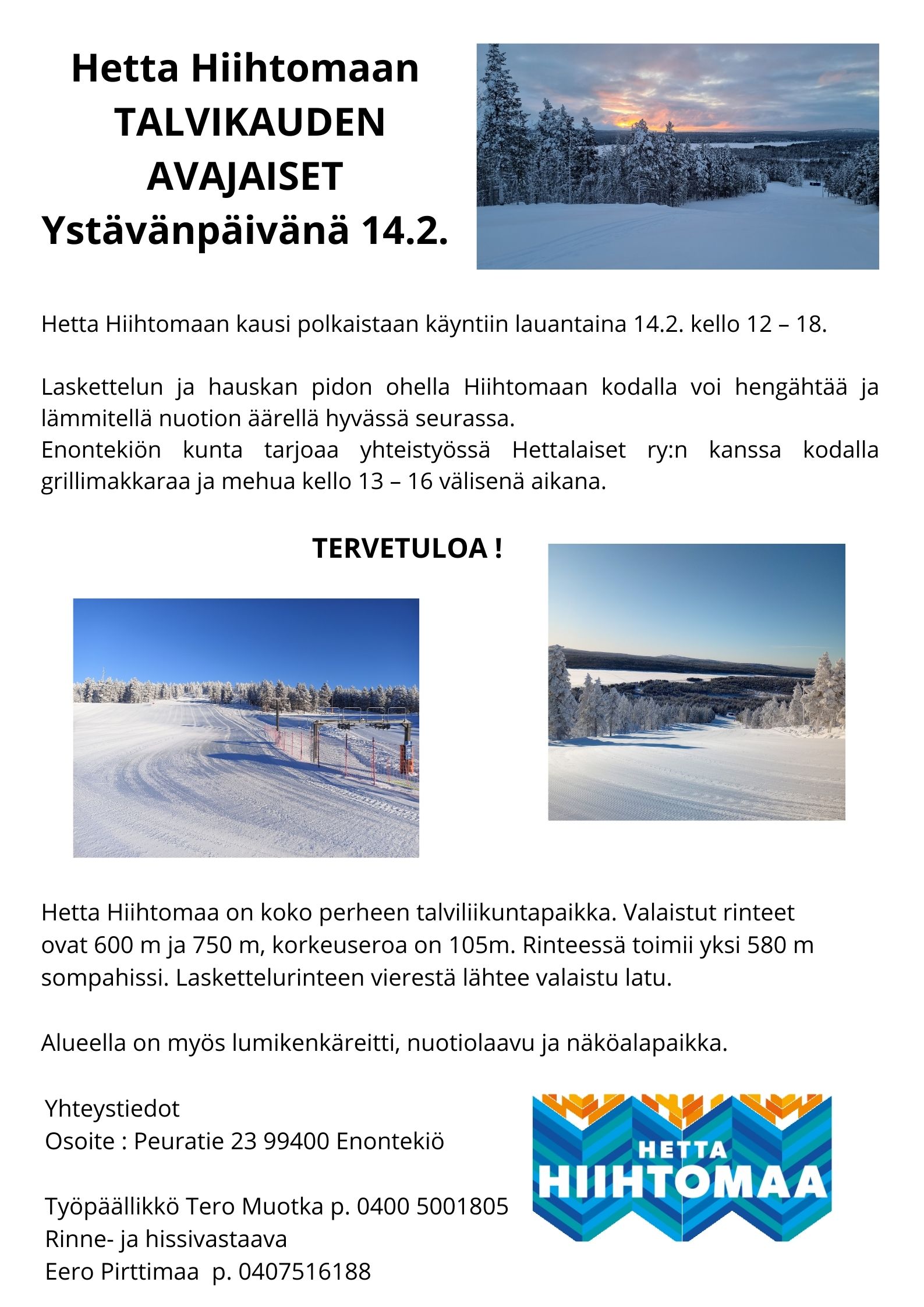 Hetta Hiihtomaa on koko perheen talviliikuntapikka. Valaistut rinteet ovat 600 m ja 750 m, korkeuseroa on 105m. Rinteessä toimii yksi 580 m sompahissi. Laskettelurinteen vierestä lähtee valaistu latu. Alueella on myös lumikenkäreitti, nuotiolaavu ja näköalapaikka. Tunturi-Lapin luontokeskus sijaitsee ihan rinteiden vieressä.